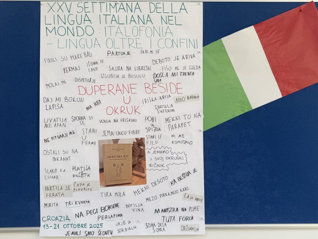 Učenici naše škole sudjelovali su u ovogodišnjem projektu tjedna talijanskog jezika u svijetu pod nazivom Italofonia – lingua oltre i confini. Učenici su proučili “Okrušku rič” – ričnik okruškog govora autorice Manuele Bareta Buličić, te pronašli izraze koji potječu iz talijanskog jezika, a i danas se koriste u njihovom mjestu. Na ovaj su način otkrili bogatstvo jezika i shvatili koliko su ovi izrazi važni za očuvanje lokalne tradicije i kulturnog identiteta, a uz to su se i odlično zabavili 🙂